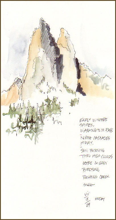 During the four days of teaching Nature Journaling at the North Cascades Institute Learning Center, my primary watercolor demonstrations were designed around painting the peaks and the trees of the region. The scale was kept small for our journaling purposes, so I presented a variety of techniques: