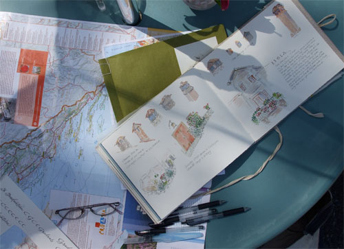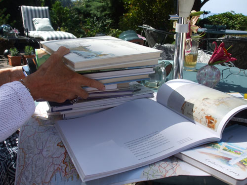 When I innocently asked Claire what books on artists' journaling she likes, citing the fact that my students have asked for recommendations, I laughed heartily when she dashed into her house and emerged with a huge stack of books she has bought and studied! A second weighty stack was brought out after lunch! Now here's a serious student…and it shows.