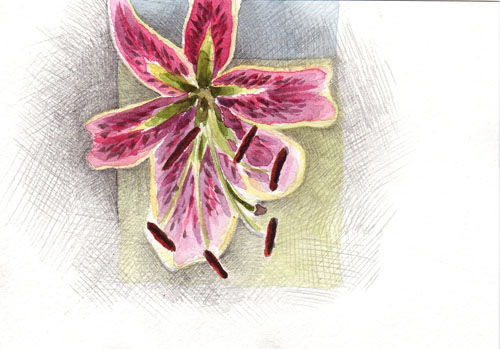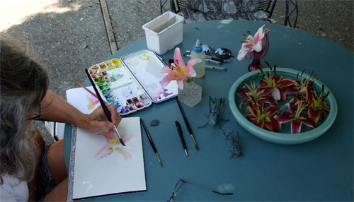 Here is Claire at the same table, after lunch, painting lilies. By the way, all the lilies grow in her garden, and they are currently at their peak.