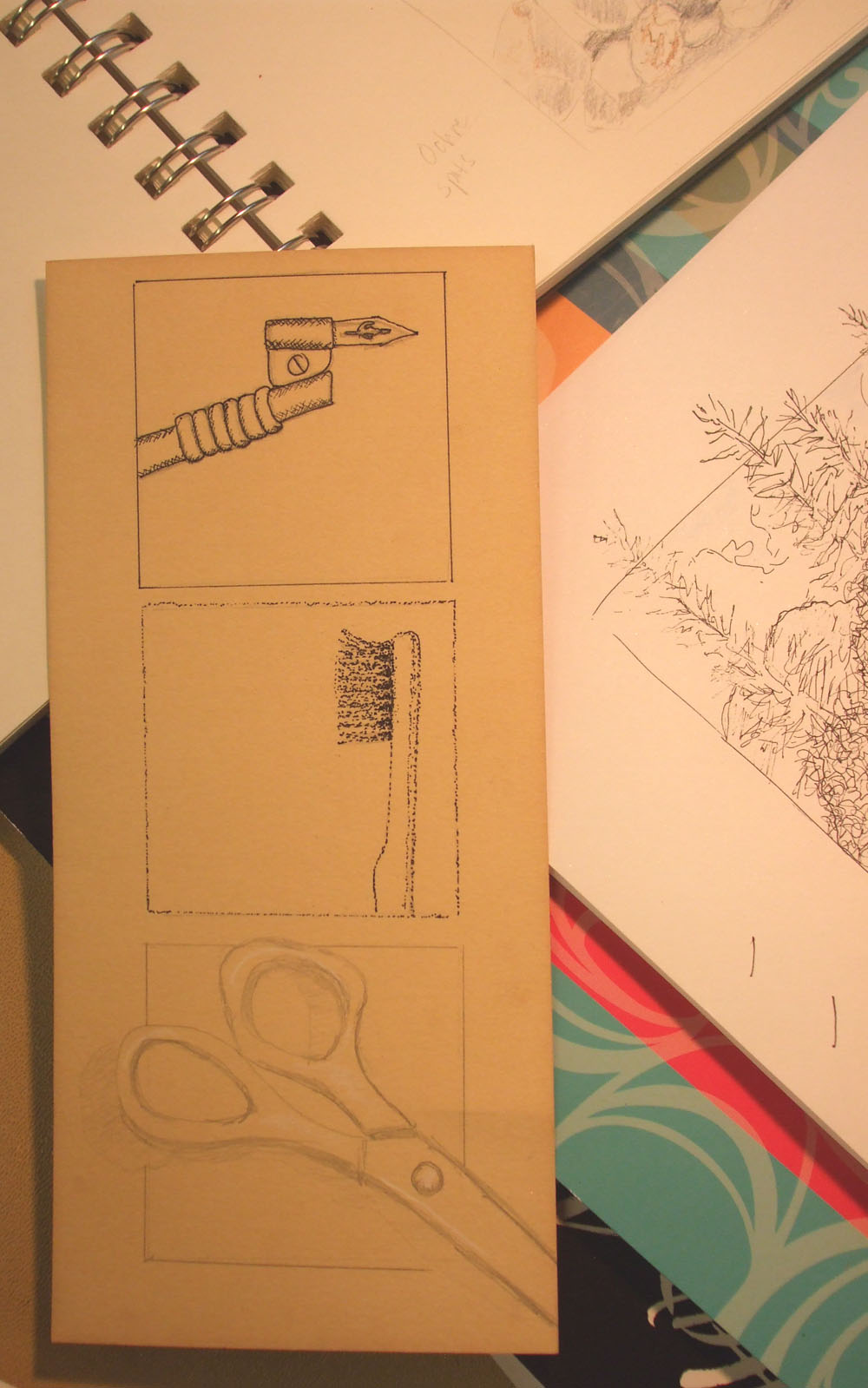 Gayle_sketches Sandy_table On the left, Gayle Waddle-Wilkes has drawn items on her table as small studies.