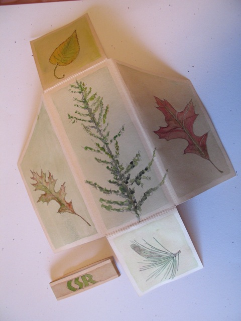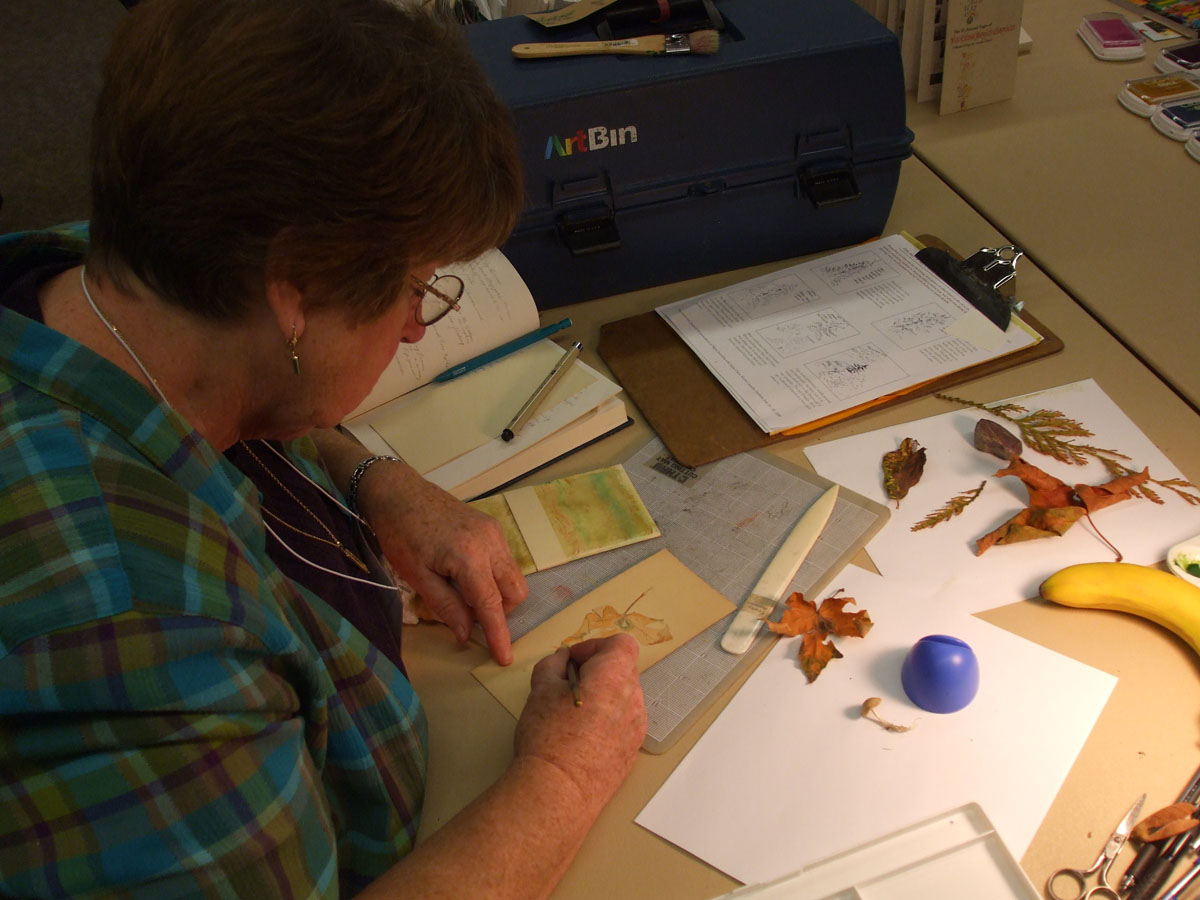 A typical studio workspace during the weekend held participants' collections of small natural objects collected from the woods, snacks, notebooks, instructions on how to draw trees, and their works-in-progress. Here is Dewey Henderson painting a maple leaf which she later cut out and applied to her journal case.