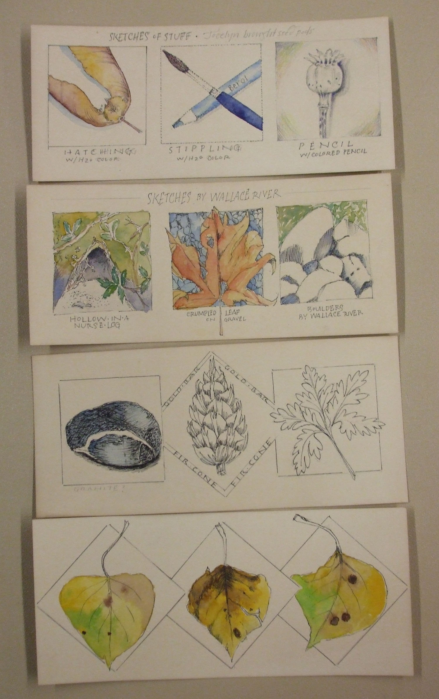 On the right are Sandy's studies of poppy seed pods and a cedar branchlet.
