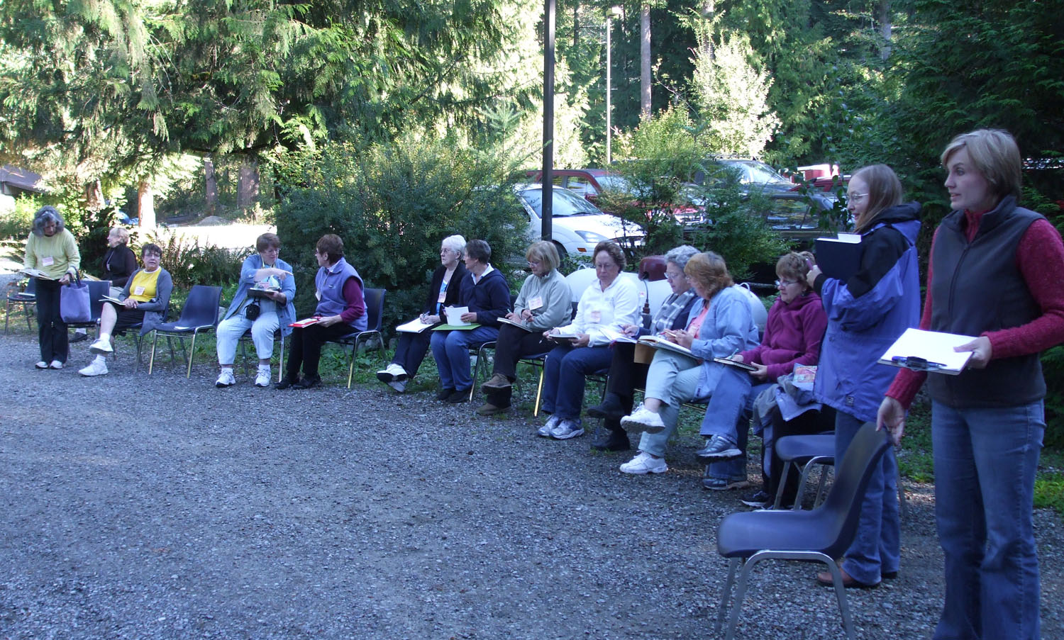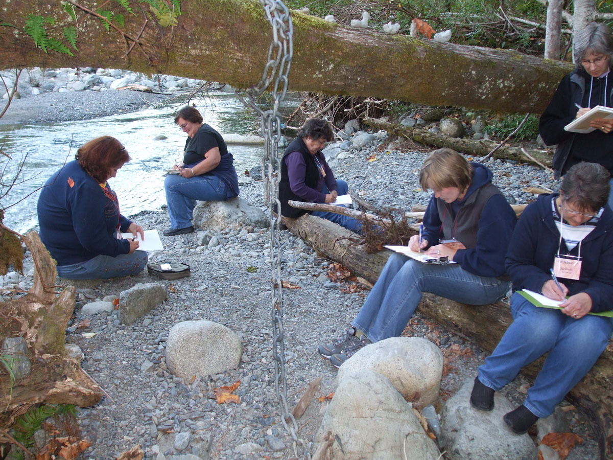 Some autumn weeks have now passed since our group of 29 convened in the foothills of the Cascades to spend a weekend together to focus on recording the natural surroundings of Camp Huston; we were well cared-for and very well fed by the conscientious Huston staff. A very special thanks goes to Flo Wilkins for her diligent, caring work in organizing the retreat. The afterglow of the three days is still with me. Why? The participants launched into the drawing lessons I gave them on Friday evening, and continued drawing, painting and writing with impressive focus throughout the three days. On Saturday, they resumed the lessons, working on the tea-dyed portfolio sheets and case I had prepared for them. We were graced by crisp, clear early autumn weather, a huge boon to the indoor-outdoor curriculum I had designed. Even by Sunday morning, in the chill of the mountain air, an energetic spirit still prevailed as we went outside for a final, difficult drawing lesson en plein air. In short: they worked hard, ate well, laughed and shared much with one another (and with me), tried new techniques, and thoroughly impressed me with their beautiful, sensitive work. Thank you to each one of you.