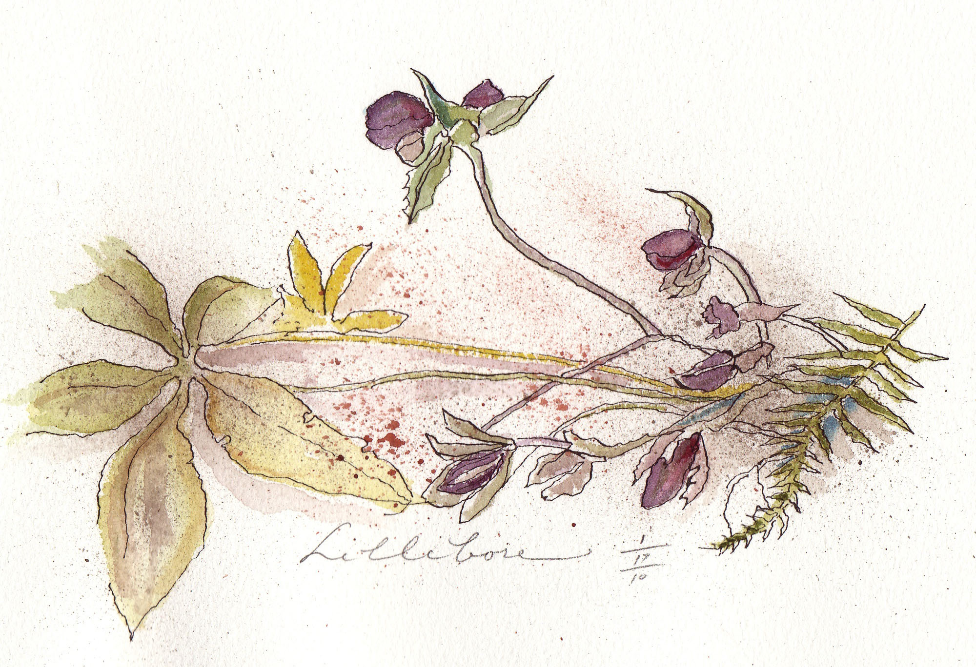 January invites Seattle area gardeners to take a hiatus from tending their plots. Sodden stocks lie on the ground along with moldy leaves that fell in autumn. It rains a lot, or it's awfully gray. Given the dreary palette, I observe from my studio window and keep my eye on the birds' coming and going. Every year, I forget to anticipate the hellebores that send up their vigorous buds in this non-gardening month! Today, in search of something to draw and feature for a post, I considered a clump of lime green lichen. Then, I remembered the purple hellebore in the deep shade of the cedar fence. Sure enough, its buds are emerging from the decay of last year's foliage. As the day's light waned, I did a quick sketch with a pointed pen and India ink. Inside, I added watercolor. Here they are. Click here to learn more about the genus helleborus.