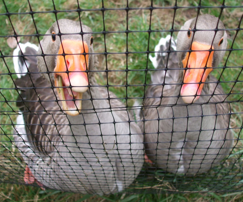 I have decided that the term hissy fit derives from goose habits. The two full-grown Toulouse geese here have become nasty fellows, hissing at me as they did during the full hour I spent cleaning out the strawberry bed yesterday! Here's one of the pix; the goose on the left tried to snatch my camera right through the fencing before this photo was taken. Amy and I braved their beaks when we walked across their territory in order to see the beautiful nest the ducks had constructed under the brush pile. We needed switches to defend ourselves from the geese' excellent beak aim. Intruders beware!