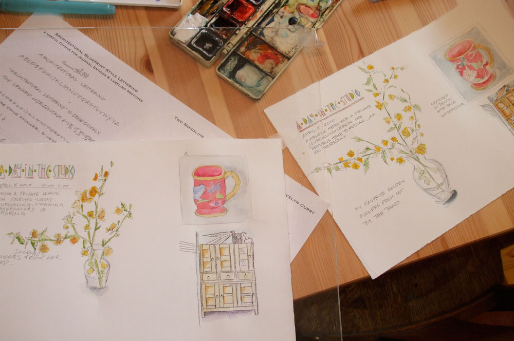 After teaching Nature Journaling at the North Cascades Institute Learning Center last July, I was asked by Marlene, one of the 15 students in the class, whether I would give her a private lesson sometime in quick sketching and light journal writing techniques. A keen learner with specific goals, she knew she'd benefit by this method of tutoring. Our three-hour session was spent in my studio yesterday as we worked in tandem with pen, pencil and watercolor. To provide a range of subjects, we sketched a vase of spring flowers, our teacups, and some of the pine furniture in my studio. A challenging range – but very well done! Marlene's nearly-completed page (more writing around the drawings will be done) is on the left.