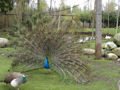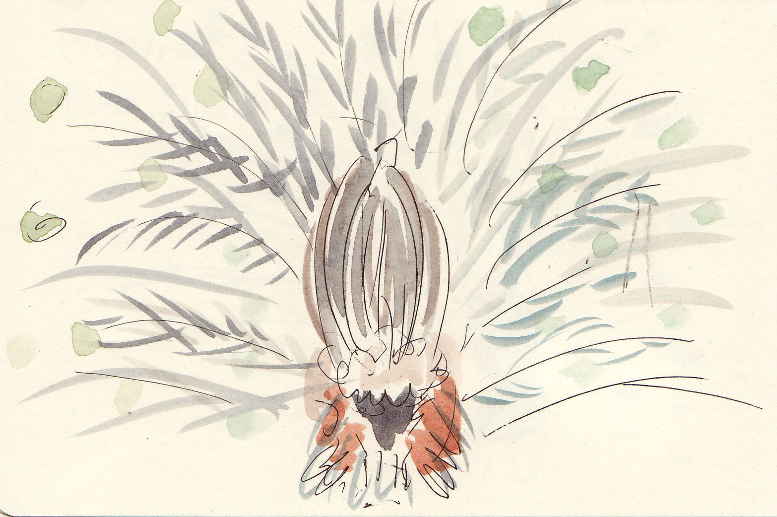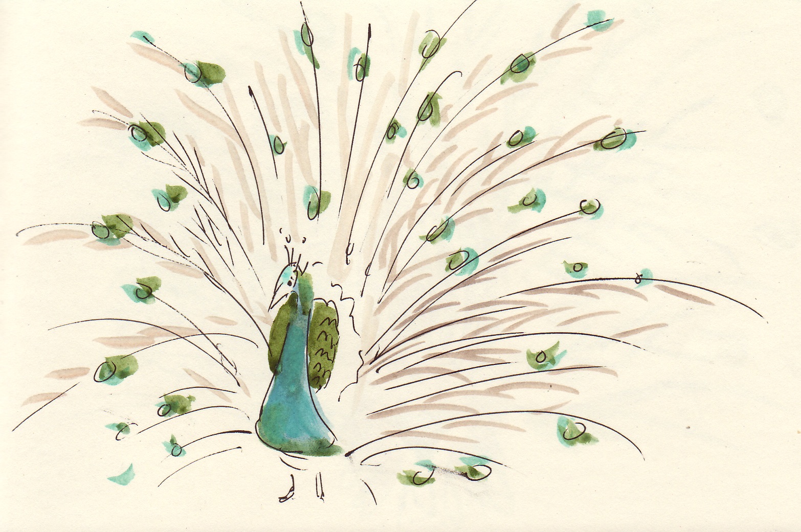 Is it possible to take peacocks for granted? They appear so often in the decorative arts that we stand to become blasé about their genuinely spectacular appearance. Last week my friend Marilyn and I went to a favorite nursery: Flower World in Snohomish, WA. Where one turns off the main road to get to the nursery is their produce and cider shop and a variety of livestock enclosures. Chickens abound (their eggs are sold there), lambs gambol about with their mothers, and the regal peacocks wander about with ducks and rabbits. It appeared to be high mating season, for the male birds were displaying fervently to the nonchalant, grazing hens. We watched for quite awhile even though the rain was coming down and the wind blew through our jackets. Peacocks don't lend themselves to 30-second sketches, but I did them anyway. Marilyn took fine photos of one of the urgent males; here they all are! One can't help but be reminded where the name peacock blue comes from. We were especially appreciative of the underrated, handsomely feathered rear side of the peacock which resembles a flamboyant Plains Indian headdress.