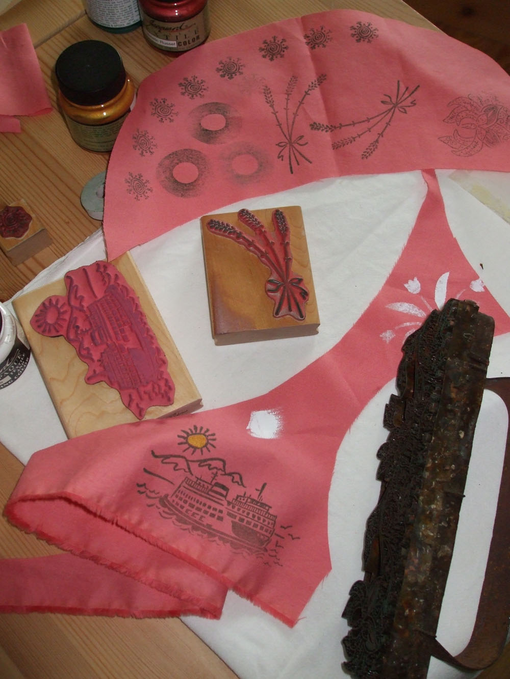In my earlier years as an artisan, I did a lot of textile artwork: batik, embroidery, stenciling and quilting. This is one of the reasons why Soft Shelter Hats has been so much fun to create. Christine, my hat buddy from Ashland, OR, dyes all her own fabrics for her one-of-a-kind cotton hats. For summer styles, I've wanted to create some unique cotton and linen hats using my own decorative elements. I've begun the experimentations as shown in the photo below. Keep an eye on Soft Shelter Hats for all of our fresh new millinery designs.