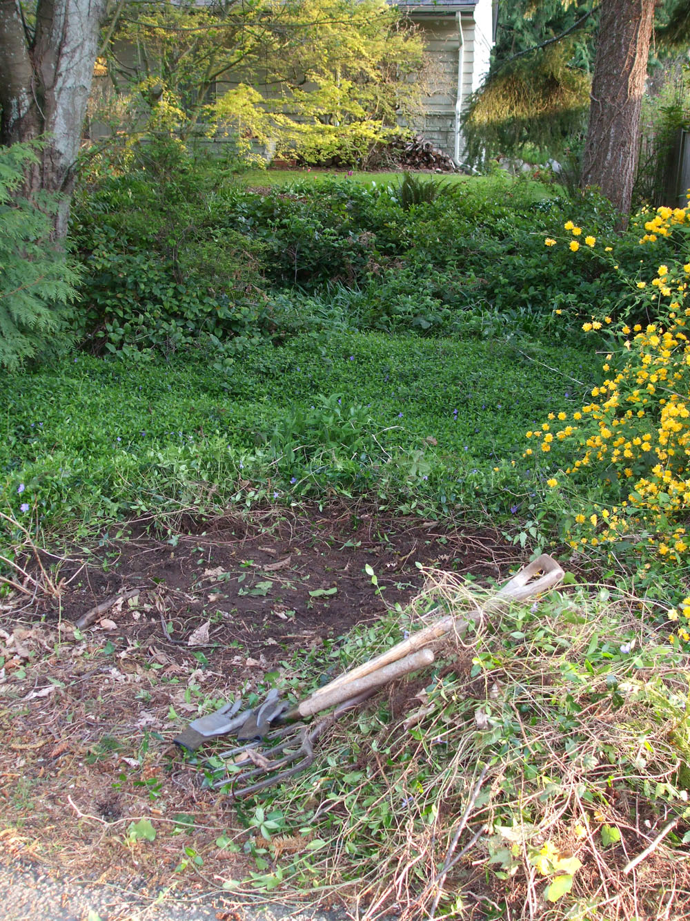 There's lots going on at my Shoreline, WA home. Project A: removal of invasive plants in our "wild" front property and the planting of natives. Yes, vinca minor makes a fine carpet, and it's pretty when it blooms, but it even chokes out English ivy. It would keep any hillside intact, too! I want to return this area to its native state, like it was when we moved here and I would find delicate salamanders out under the woodsy debris. This year, our property has been selected to be on Shoreline's tour of wildlife-friendly yards (July 10 – more info to come). This is incentive for me to keep on grubbing and replanting.