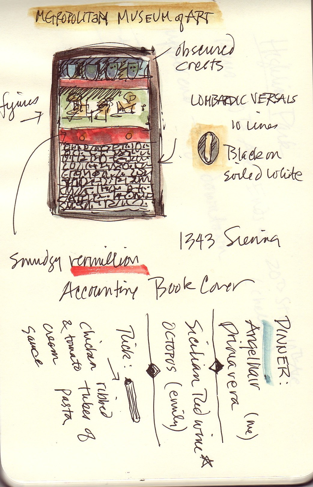 A medieval wooden book cover at the Metropolitan displays irresistable (to me) Lombardic versal letters. We walked across Central Park and met a friend for dinner after the museum visit. Menu items are listed.