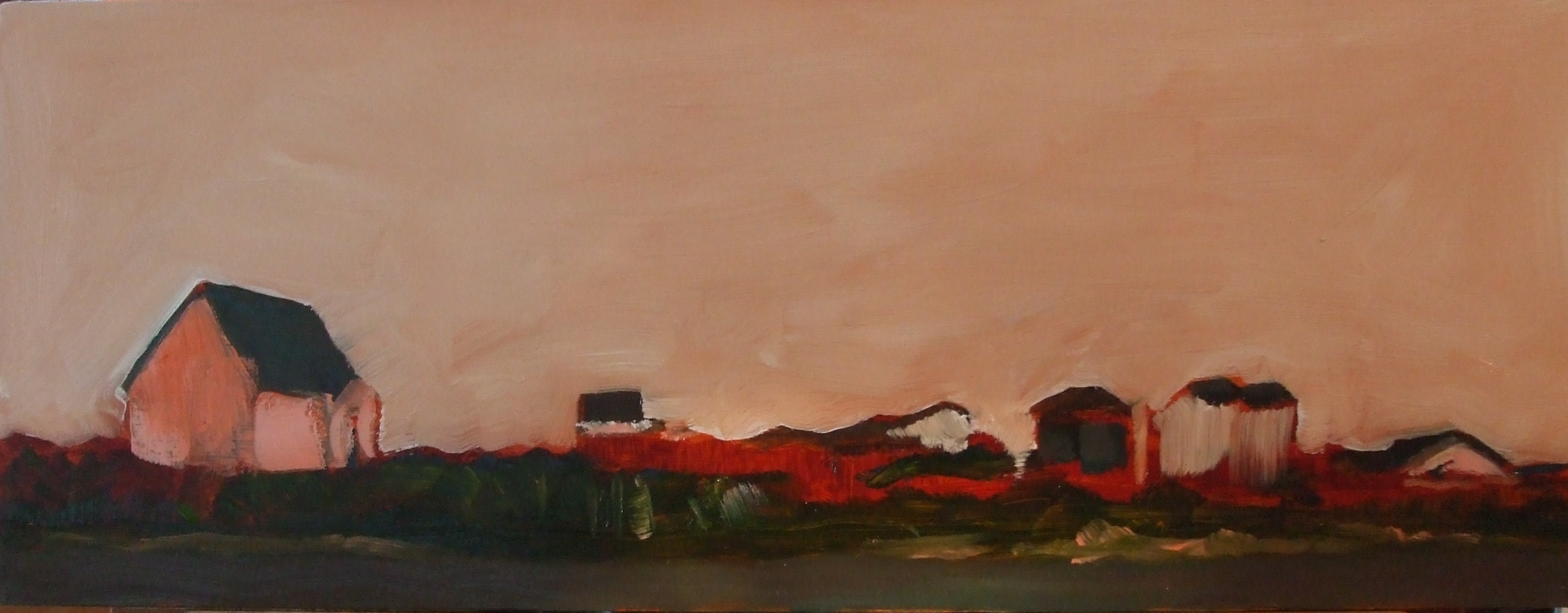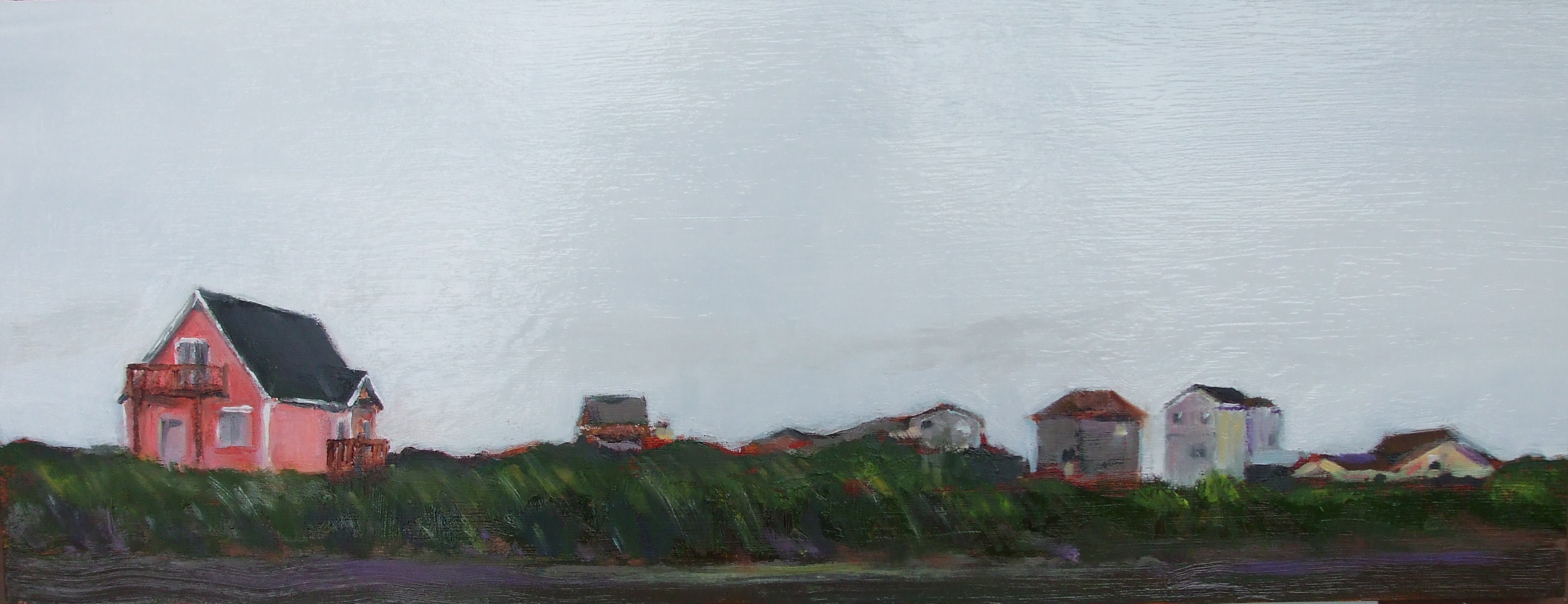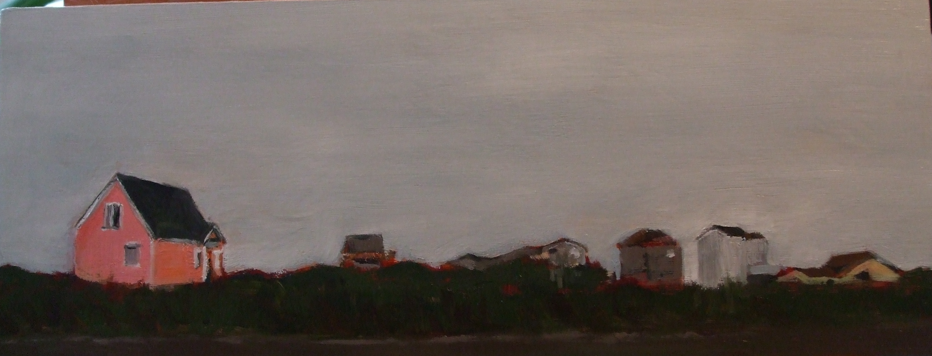 Above, I had applied a light coat of titanium white over the sky. Below, the painting is further developed by my working on the buildings other than the large pink house. I applied an overall coat of gray over the sky.