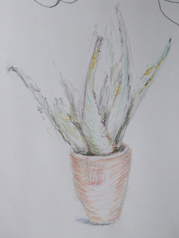 As a last subject, I offered an aloe plant in an orange pot. With five minutes left in our session, we had no choice but to work quickly and confidently to get the basic shapes indicated on our paper. By this time we were warmed up after our first two subjects. We ended up going overtime, finishing our sketches with focus in 18 minutes. (Mine is on the right.) When students ask me how to achieve a spontaneous look to their sketches, I usually tell them that it has to do with speed & lack of time to overthink it. With the aloe plants, I talked us through a sequence of drawing moves. The result: some nicely impressionistic aloe vera plants!