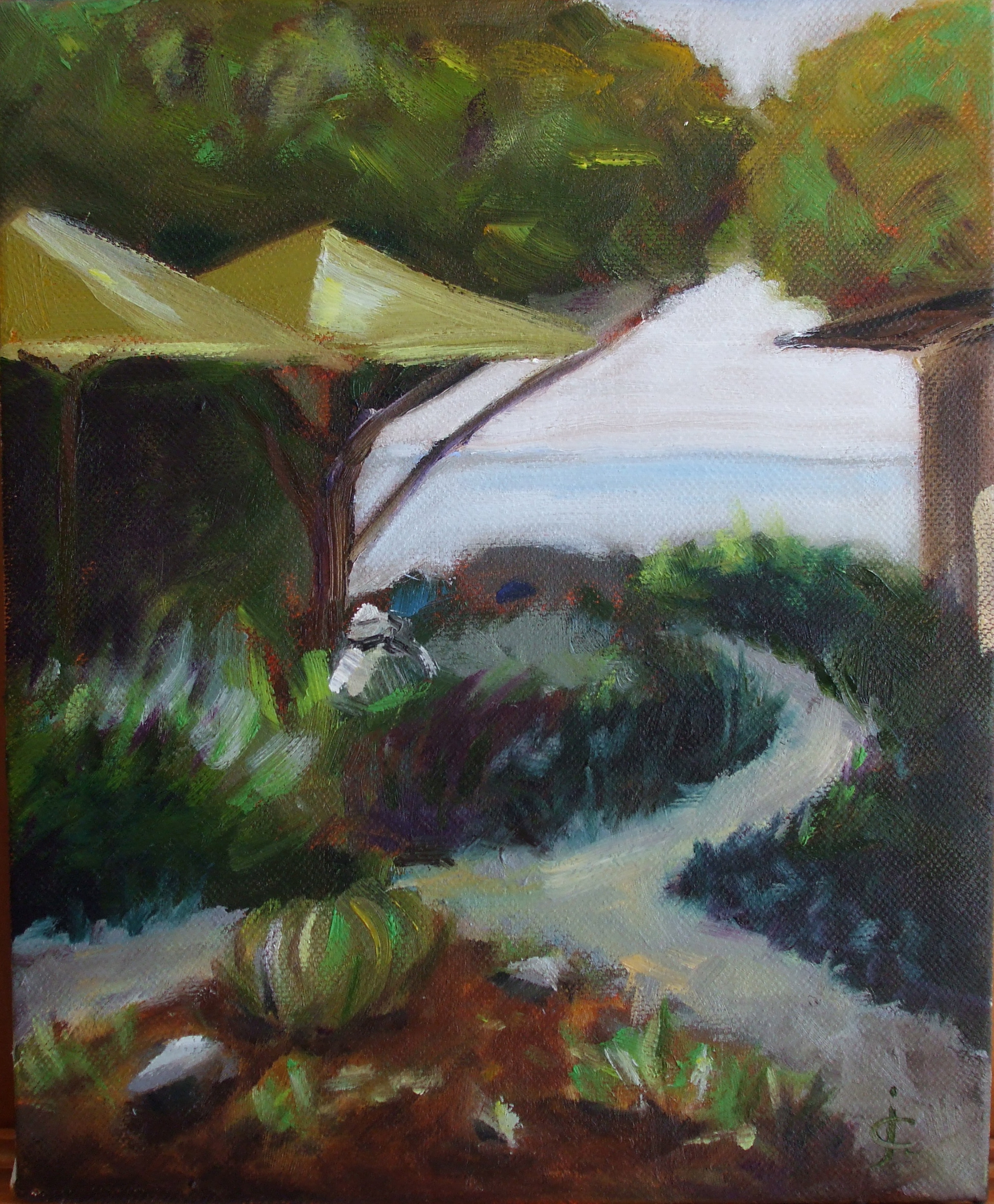 Today, I reserved time to finish a painting I began in early July. That day was spent in my friend Claire's garden, with her painting lilies in watercolor while I painted a garden scape in oil that included her as she sat under one of her chartreuse patio umbrellas. If the day sounds idyllic, it was. We spent some six hours painting, primarily, with the occasional check-in on one another. I even took a nap in my chair at one point, lulled by the radiant sun that day. Here is the finished painting which I'm giving to Claire in recognition for the years of her life spent weeding that glorious garden: